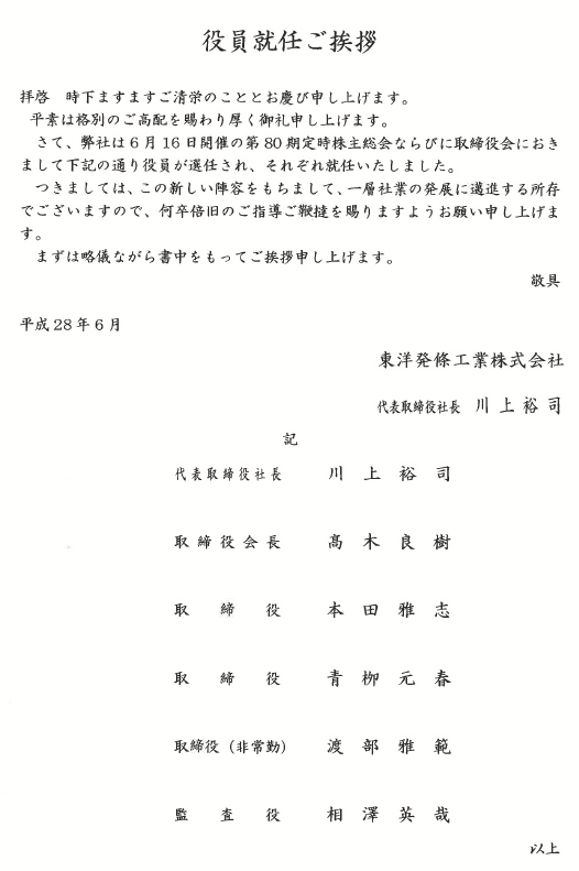 平成28年6月16日付けで、弊社の役員人事が変更となった為、